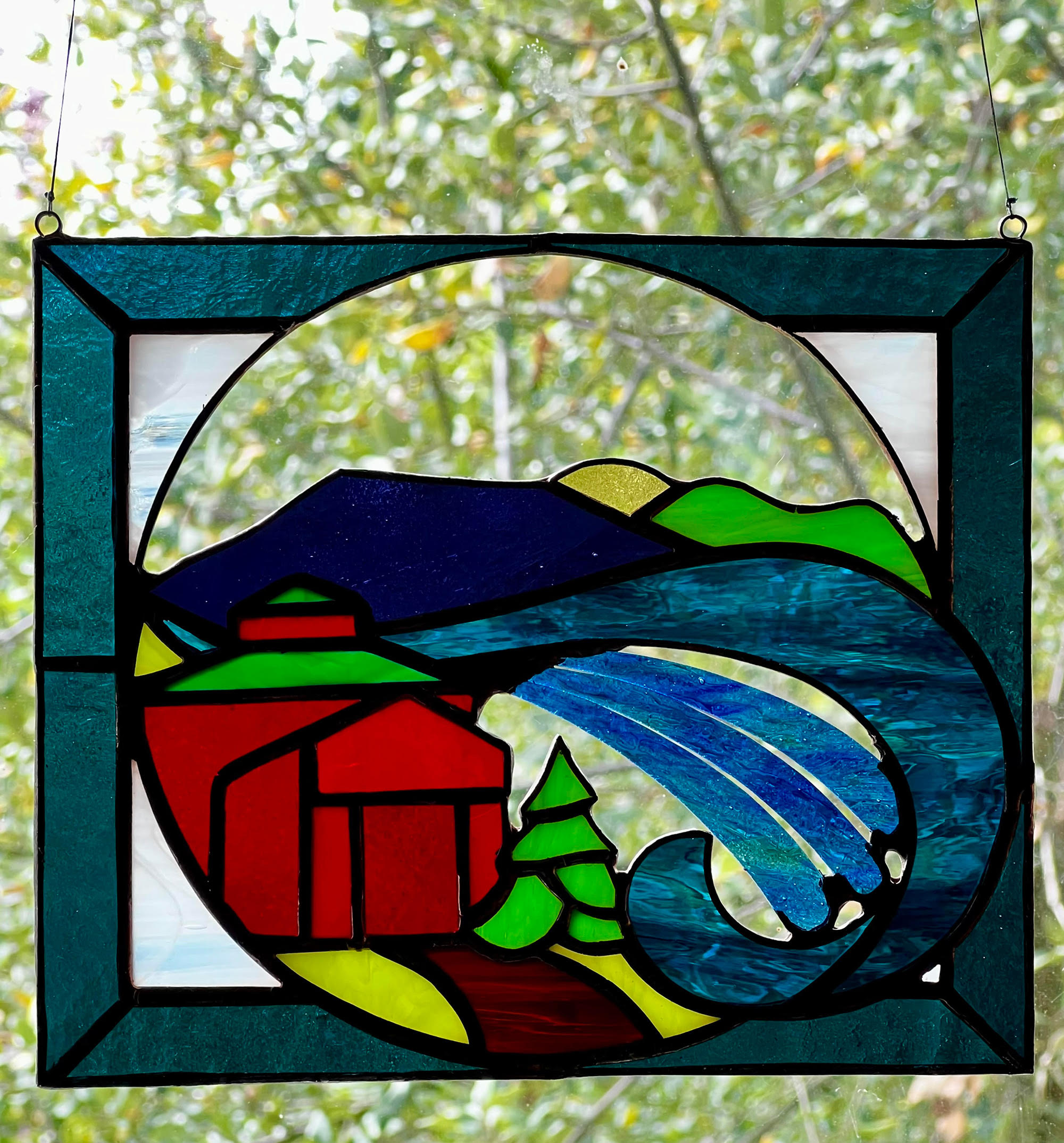 The Sun Catcher is made of glass and measures 7″ wide, 6 ” tall. It is made of 12 different stained glass colors, Copper foil with lead/tin solder and brass patina.