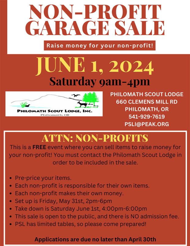 Spend your day shopping for a cause at the Philomath Scout Lodge’s very first Non-Profit Garage Sale on June 1st, happening from 9 AM to 4 PM at 660 Clemens Mill Rd. This unique event features booths from 12 local non-profits,
